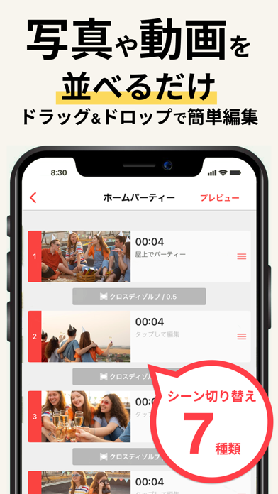 写真や動画の切り替わりのところで、トランジションという7種類のエフェクトがあり、スマートな動画の繋ぎ合わせが可能です。