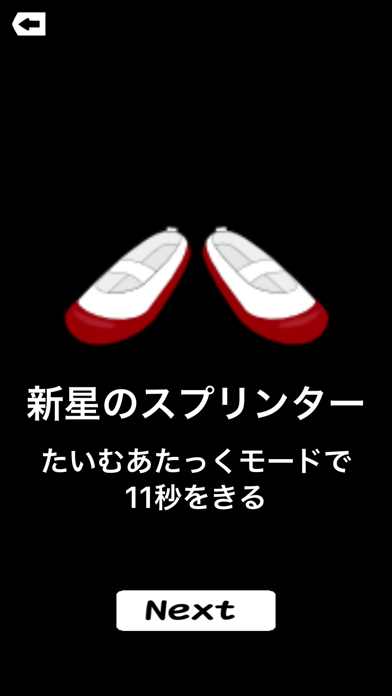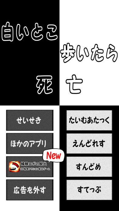 ゲームをスタートすると目の前に白マスと黒マスが現れるので、白マスをタッチしないように気をつけながら黒マスをタッチしていきます。間違えると即ゲームオーバー、死亡しないように慎重に進めていきます。ゲームモードは50歩すすむまでのタイムを競うタイムアタック、10秒以内にどこまで進めるかを競うエンドレス、10秒ギリギリまでで止める寸止めの3つを用意。やればやる程に記録、スピードが増していくのが本ゲームのハマる所です。