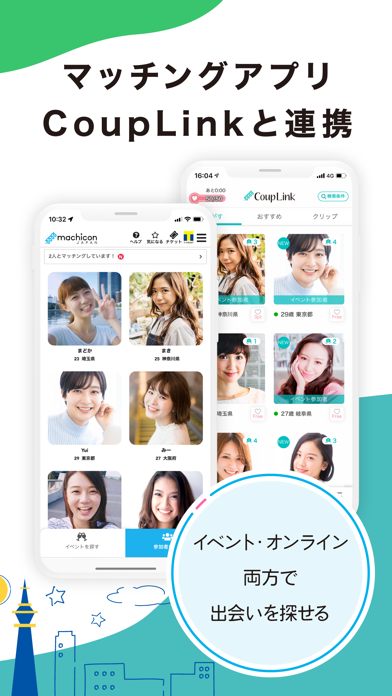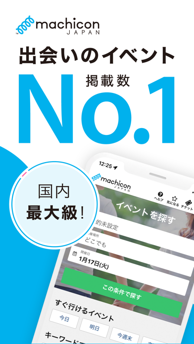 全国各地の街コン、パーティーを簡単に検索することができます。日程や場所を指定して瞬時にイベントを見つけられる機能が特徴的。もしイベントが中止になっても全額返金されるので安心して参加できます。身分証の確認で安全性も高く、出会いを探している人にぴったりのアプリです。