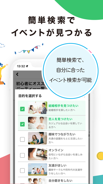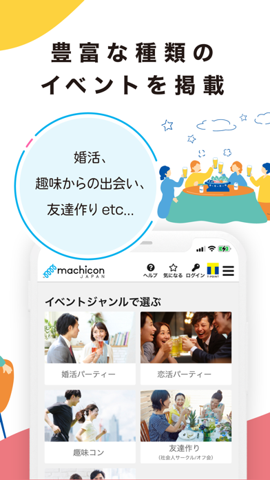 恋人づくりや友達づくりなど、さまざまな目的のイベントを見つけられます。探せるイベントジャンルは、恋活パーティー・婚活パーティー・趣味コン・友達づくり・自分磨きセミナー・婚活相談の6種類。自分の目的に合ったイベントとの出会いが期待できます。