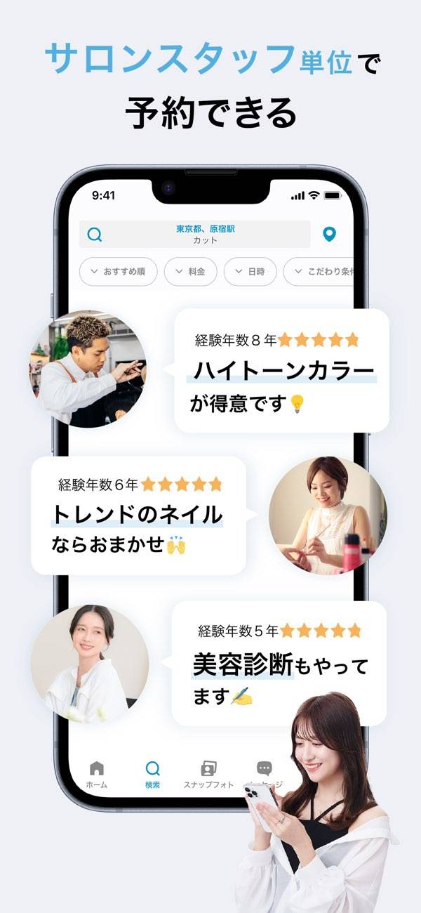 お気に入りの美容師やネイリストが見つかるアプリ。お店ごとではなく、サロンスタッフごとに登録されているのが特徴です。口コミやアピールポイントを見てじっくり選べます。