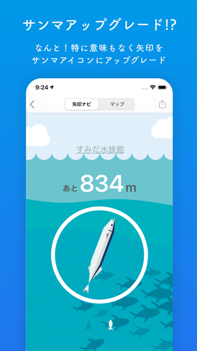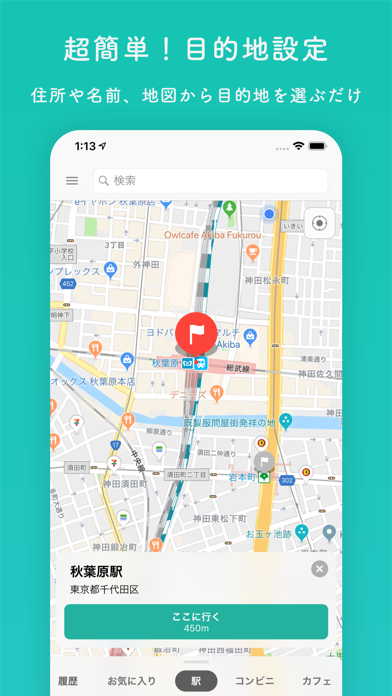 地図を見るのが苦手な人でも使いやすいナビアプリです。目的地までの方向が矢印で表示され、到着までの距離も見せてくれます。地図アプリだと画面を回しながら道順を確認しがちな人も、進むべき向きがひと目でわかって安心です。
