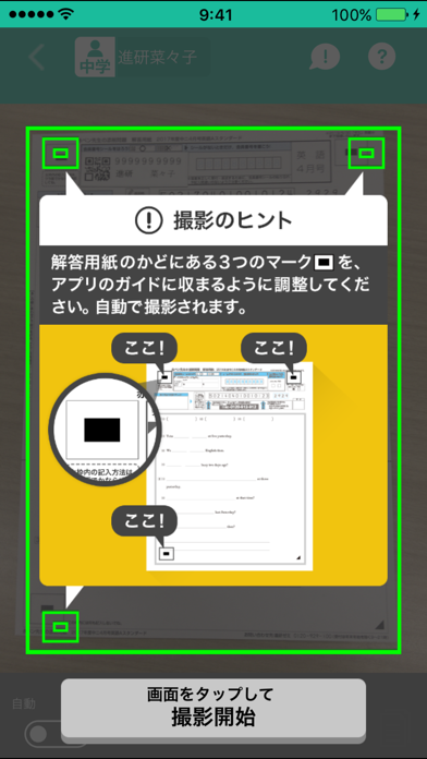 使い方としては、まず会員番号とパスワードを入力します。こちらは「進研ゼミ中学講座<プラスアイ>」「進研ゼミ難関私立中高一貫講座<チャレンジネット>」で使用しているものを入力します。入力してログインすれば、カメラが起動して撮影を行えます。撮影は解答用紙に書いてあるマークに枠を合わせるだけで自動的に撮影してくれるので、とってもカンタンですね。