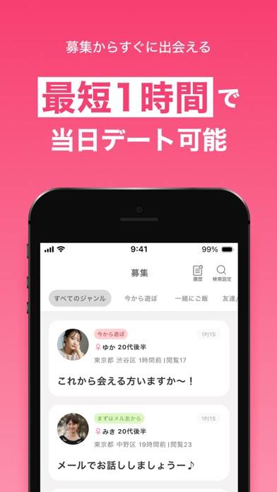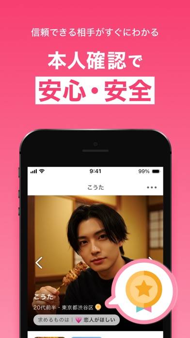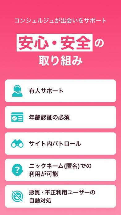 出会い系アプリの中でも、特に安全対策に力を入れています。業者やヤリモクなどの悪質ユーザーへの対応がしっかりしているので、ちゃんとしたユーザーと出会いやすいです。わからないことがあれば、専任のコンシェルジュがメールで対応してくれます。