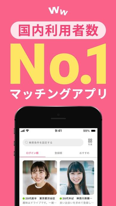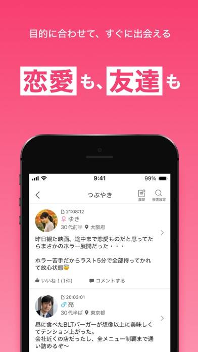 つぶやきやコミュニティなどで交友関係を広げながら出会えるアプリ。SNS感覚で気軽な出会いができるので、遊び目的や気軽な恋活をしたい人に合っています。