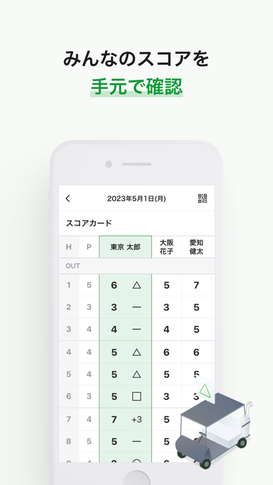 プレー中には参加者のスコアをアプリからまとめて確認できます。カートナビで入力したスコアをリアルタイムで連携し、今の状況をいつでもすぐに見られるので、勝負の面白味も増すでしょう。