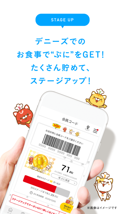 クーポンをもらって、デニーズをお得に利用可能です。会計時に会員コードを見せることで、「ぷに」を貯められます。規定数の「ぷに」を貯めると、会員ステージアップ。特別なクーポンを獲得できますよ。