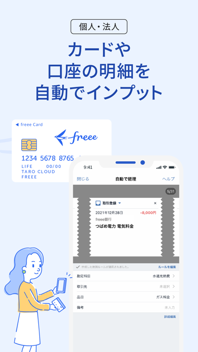 レシートを撮影するだけで取引内容を読み取ってくれる機能や、連携したクレジットカードから収支を自動で記録してくれる機能もあり、会計の知識がなくてもスムーズに帳簿をつけられます。