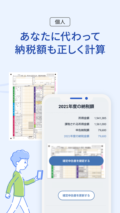 仕訳の登録や確定申告書の作成ができる会計アプリ。撮影したレシートの内容や、連携した銀行口座・クレジットカードの明細を読み取って、自動で仕訳を登録できます。申告書の作成も、ステップやチャートが用意されているため初心者でも安心です。