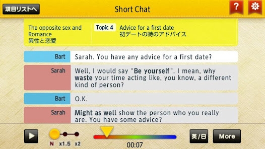 日本人が英語を覚えようとするときはどうしても、日本語と意味を見比べながら覚えていきますよね?しかし、そうした覚え方は正確にゆっくり意味を理解するときにはいいですが、英語を日本語に直してから理解する脳のクセがついてしまい、テンポよく進む会話には不向きです。このアプリは日本語を意識せず、英語は英語として覚えるように重点が置かれているので、英語耳を鍛えて会話に慣れるためのトレーニングに最適です。