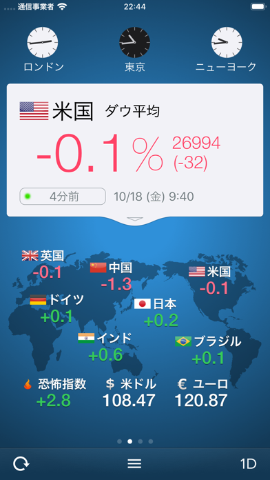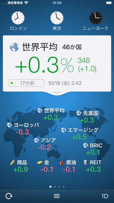 各地域の平均株価や原油価格などを、前日比で表示してくれるアプリ。世界平均-0.2%、ヨーロッパ+0.1%といった形で表示され、各指標をタップすれば現在値などの詳細も見られます。リスト画面ですべての指標を確認することもでき、10年平均から1ヶ月累積まで期間の切り替えもスムーズです。