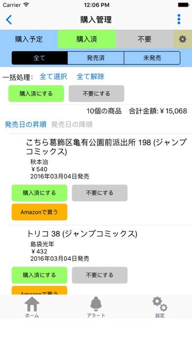好きな作品の購入管理を本アプリで行うことができます。アラート登録した作品を自動で商品リストに加えてくれるためとても便利。本機能では購入済みの作品や購入予定の作品をひと目で把握できるため、同じ本を二度買ってしまう心配がなくなります。