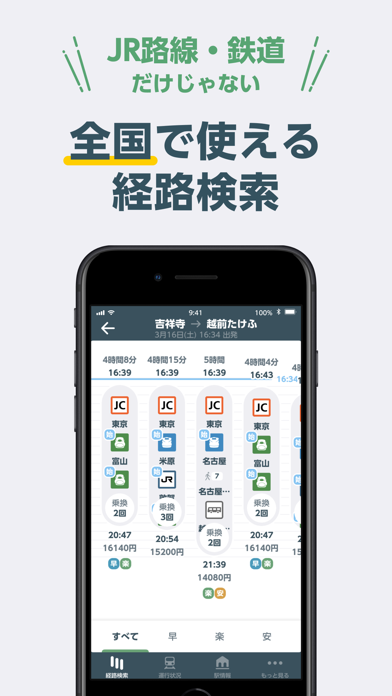 縦型で乗り換え方法が比較できるようになって直感的になった!文字のサイズが大きめで読みやすいし、他のアプリにはないみてるだけでワクワクするようなデザインも個人的にお気に入り。