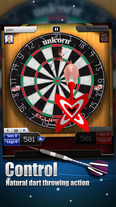 - 3Dでリアルに再現された、画面スワイプで遊ぶダーツゲーム