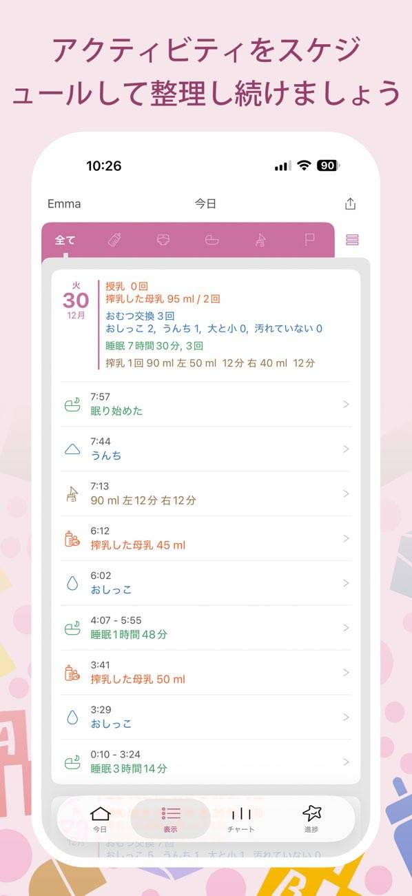 チャートの記録を見返すことで赤ちゃんの成長をより実感。行動パターンも把握できるようになるでしょう。チャートはそれぞれ授乳やおむつ交換、マイルストーンなどカテゴリーごとの表示もできます。