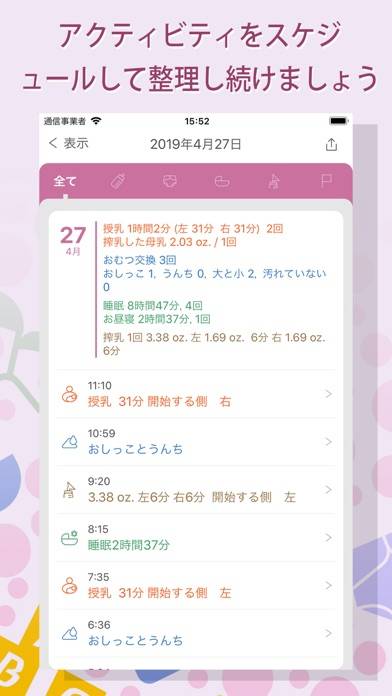 チャートの記録を見返すことで赤ちゃんの成長をより実感。行動パターンも把握できるようになるでしょう。チャートはそれぞれ授乳やおむつ交換、マイルストーンなどカテゴリーごとの表示もできます。