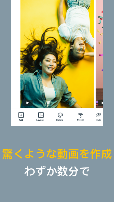 操作が簡単な動画アプリです。編集したい動画を選んで、テーマを選んで、BGMを足すだけで、あとはアプリが自動的に加工してくれます♪色合いがインスタみたくてオシャレでおすすめ。