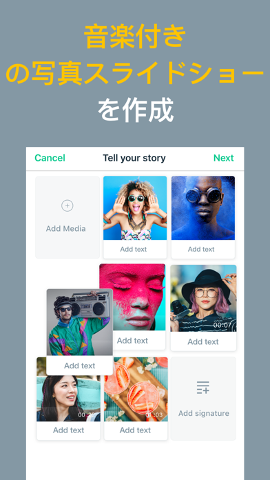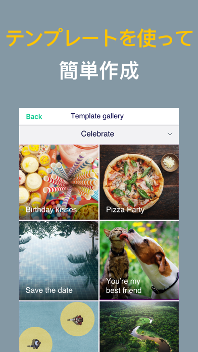 複数の写真、動画を選んで、テンプレートをチョイス。それだけで手のこんだスライドショー動画が作れる。