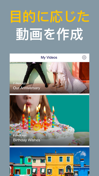 - ビデオ・テーマ・BGMを選ぶだけ。編集不要で動画が作れる