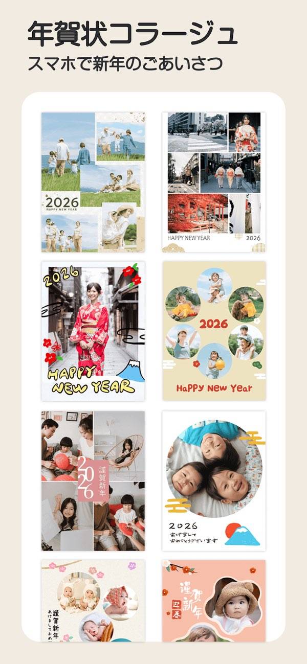 複数の写真を組み合わせて作れるコラージュ機能には、おしゃれなレイアウトがたくさん。背景にテーマごとのフレームを入れたり、マジックブラシでキラキラを描いたり、まるで雑誌の1ページみたいな仕上がりにできます。旅行の写真を1枚にまとめたいときにも大活躍です。