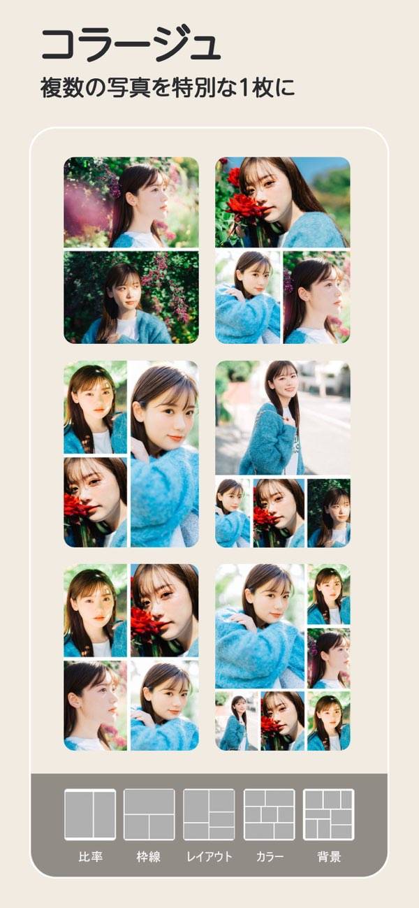 複数の写真を組み合わせて作れるコラージュ機能には、おしゃれなレイアウトがたくさん。背景にテーマごとのフレームを入れたり、マジックブラシでキラキラを描いたり、まるで雑誌の1ページみたいな仕上がりにできます。旅行の写真を1枚にまとめたいときにも大活躍です。