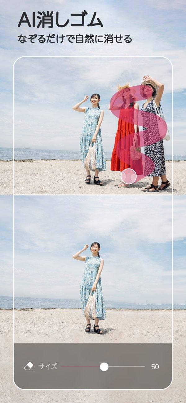 写りこんだ通行人や余計な背景は、直感的な「消しゴム」操作でサッと消去。ぼやけた写真はAIがクリアに補正してくれます。どれも自動補正付きなので、やりすぎ感のない自然な見た目に仕上がるのがうれしいポイント。大切な思い出の1枚もきれいによみがえります。