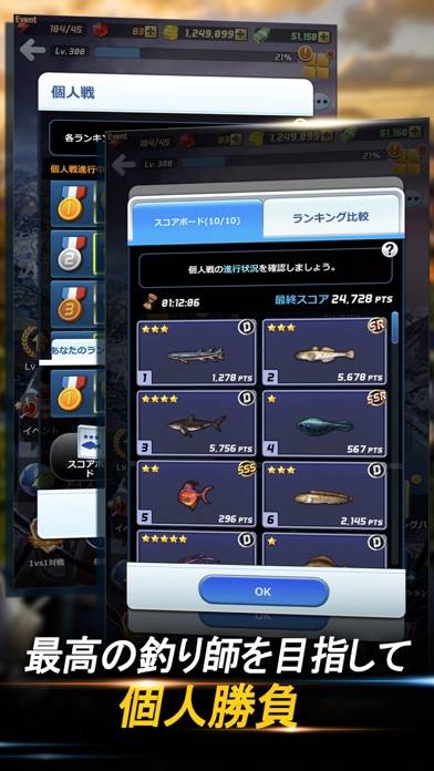 - 釣竿のランクが上がると大物を釣りやすくなる。装備の種類も豊富