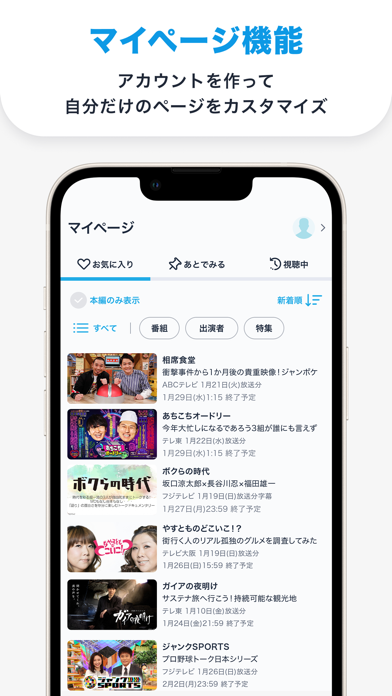 テレビ番組をスマホで見るならTVerが一番便利だと思います。かつてはワンセグの小さいカクカクとした小さい画面でしか外ではテレビを見れなかったのが懐かしいです笑 その点TVerは画質も良いですしスムーズに視聴できるのが最高です。後、重要なのがお気に入り登録ができ自分の好みの番組だけマイページで一覧で見ることができるのが便利すぎます。それとあまり知られていませんが出演者もお気に入り登録できるので好きな芸能人を登録しておけば見逃しもないですし、普段見る機会のない番組も見ることになるので新たな発見にもなって新鮮で楽しいです。