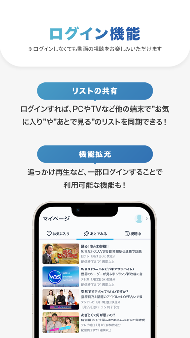 完全無料かつ会員登録しなくても使えるのが特徴。仕事などで番組を見られなかったときも、気軽にアプリから見られて安心です。