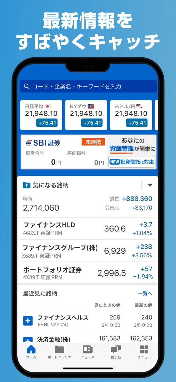 株の取引やFXをする人に必要な情報が詰まったアプリです。ホーム画面には日経平均などの株価情報、作成したポートフォリオと、あらゆる情報がまとまっています。朝起きて、まず本アプリを開いて、1日の情報を取得しましょう。