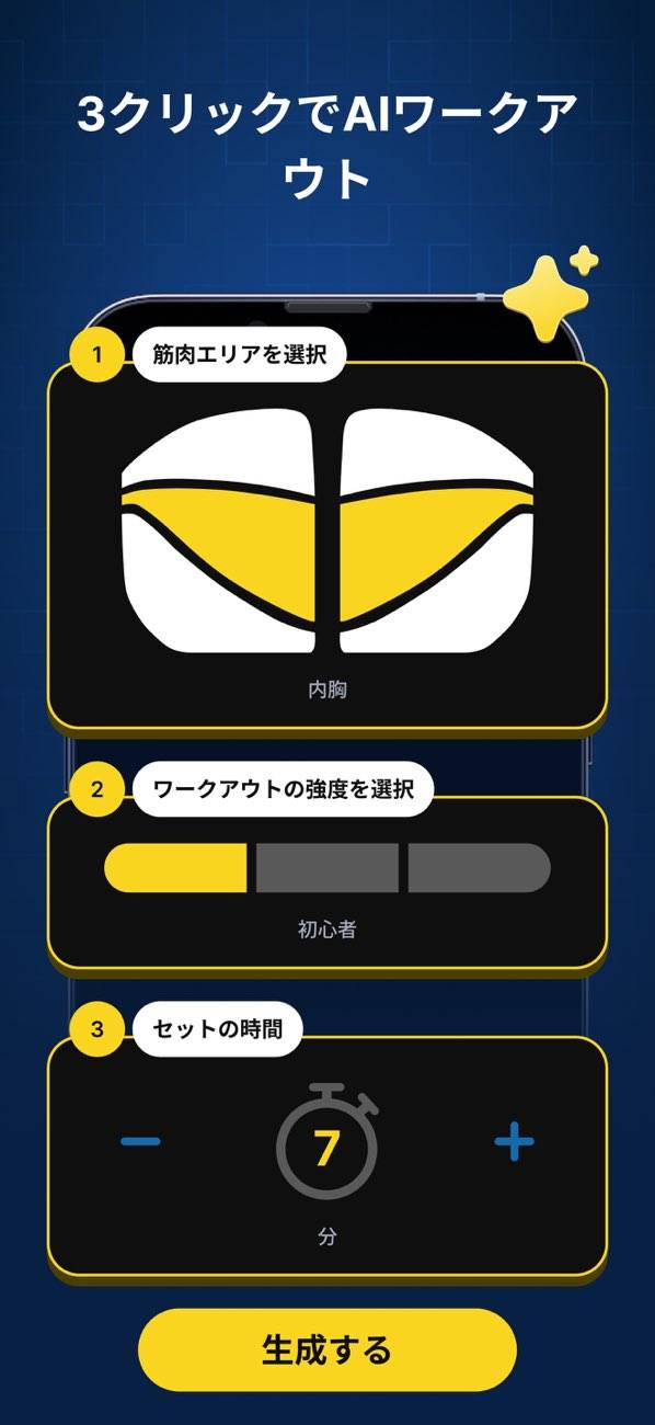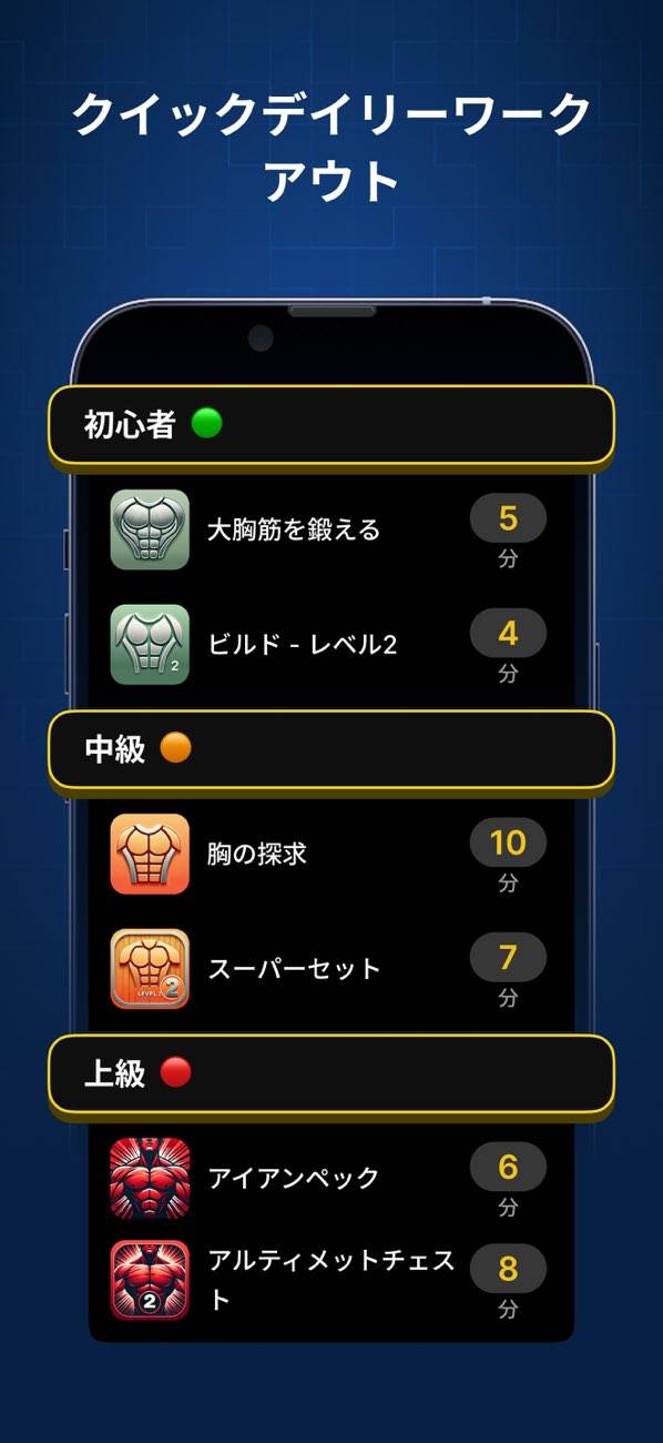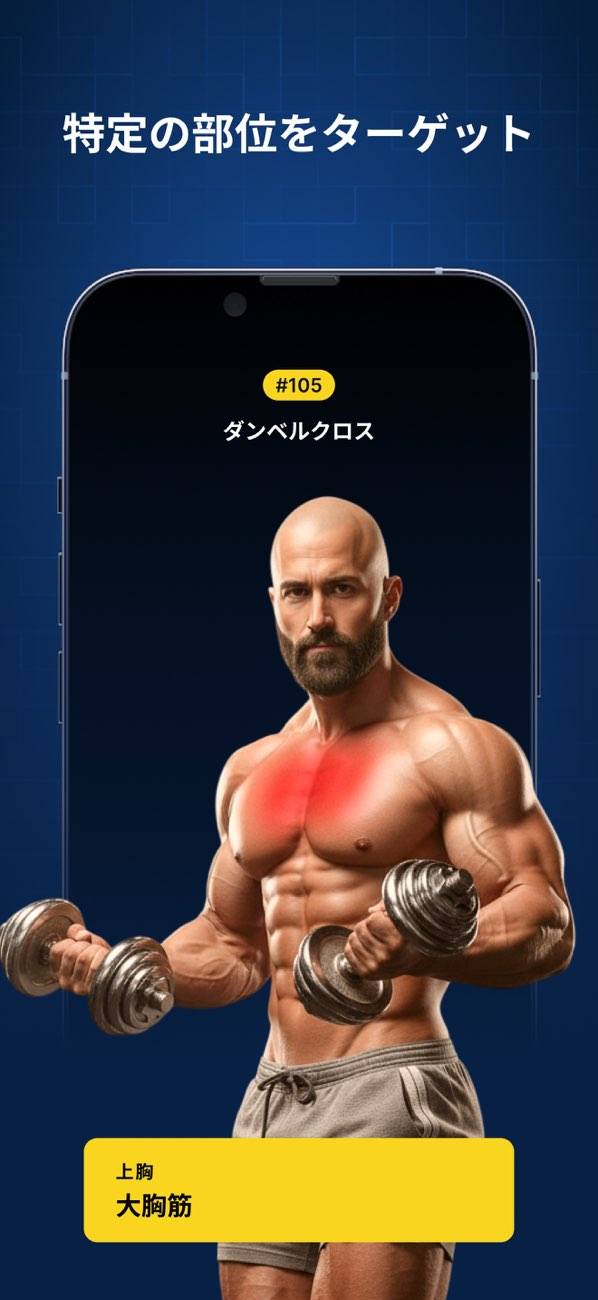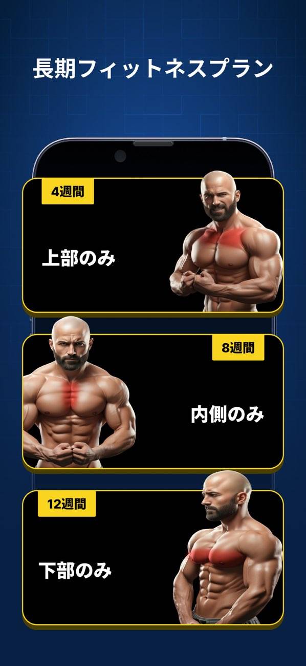 さまざまな目的に沿ったトレーニングプランを用意。「胸部の上半分をピンポイントで鍛えたい」「内側を鍛えたい」など細かいニーズに沿ったプランが組まれているので、幅広い目的で利用できます。