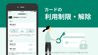 クレジットカードの利用明細や次回の支払い予定額、ポイント残高をひとつの画面で確認できる公式アプリ。SMBC IDでログインし、一度設定すれば生体認証でスムーズに再ログインできます。