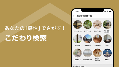 厳選されたこだわりのある物件が掲載されています。本アプリは、スタッフが独自視点で厳選した物件を紹介しているとのこと。デザイナーズマンション、リノベーション物件、古民家など、一般の不動産アプリでは見つけられない個性的な物件を見つけられます。