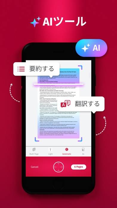 文書やQRコードを瞬時にスキャンできます。たったワンタップで、高品質なPDFやJPGを生成し、さまざまなクラウドサービスにアップロード可能。カメラを書類に向けて動かすだけで、自動で認識してくれるのが特徴です。