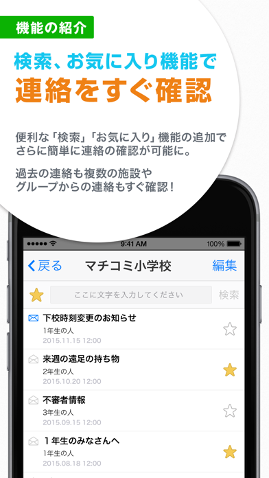 学校などからの重要なお知らせがいつでも確実に届きます。児童IDもしくは対応する施設のメールアドレスを登録しておけば、必要な情報がプッシュ通知で確認可能に。お気に入り登録や検索機能を利用すれば、過去の連絡も簡単に見つけることができます。