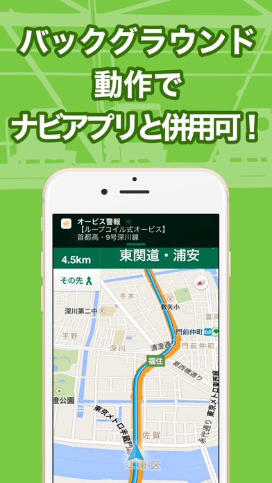 バックグラウンドモードをオンにしておけば、このアプリを開かなくても音声で警報を受け取れます。Googleマップや標準マップアプリと併用して使えるため、ナビを切り替える手間がなくて便利。通知は音だけでなく通知センターにも表示されるので、画面を見ていなくても情報を受け取れます。