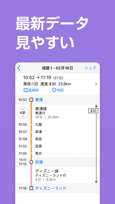 このアプリでは、香港メトロの路線図と運行情報を詳しく確認することが可能です。出発駅・到着駅・時間を設定するだけで、最適な乗換案内を表示してくれます。