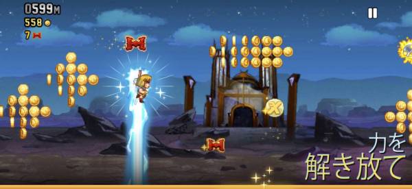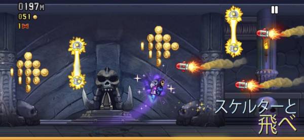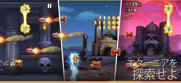 タップ操作で手軽に楽しめる一方で、飛び上がるタイミングや空中飛行を維持する操作性にスリルあり。またステージ中に獲得できる多彩なジェットパックで、さまざまなアクションを楽しめます。