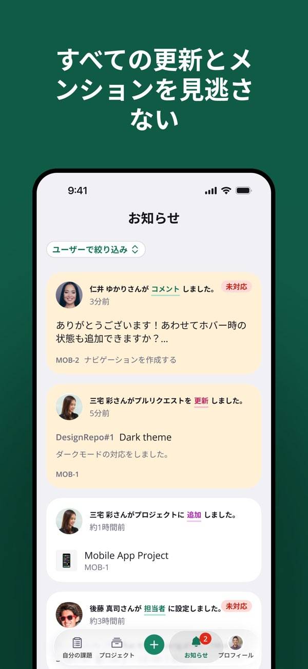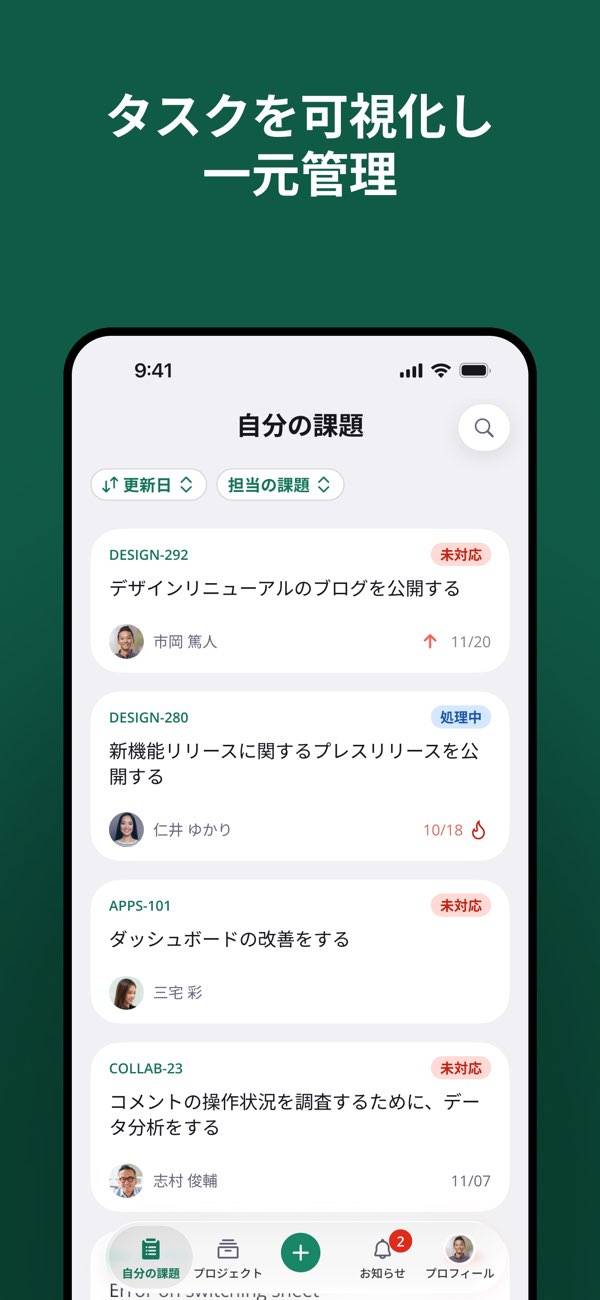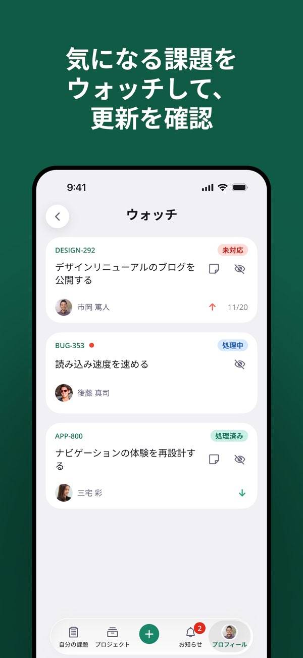プロジェクトの情報や各メンバーのタスクを一元管理できるアプリ。自分に割り振られた課題はウォッチリストで個別に管理でき、見落としを防げます。ファイルやコメント・引き継ぎ事項もまとめて管理しておけるので、情報の参照が効率的になるでしょう。