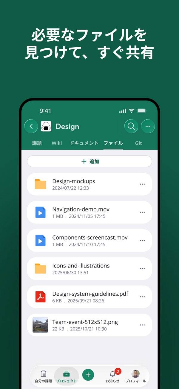 タスクの過程で問題が発生した場合、バグや要望の報告ができます。問題点を早期に特定し、迅速に対応できるでしょう。ファイルの添付も可能なため、参考資料も共有しやすいのが強み。