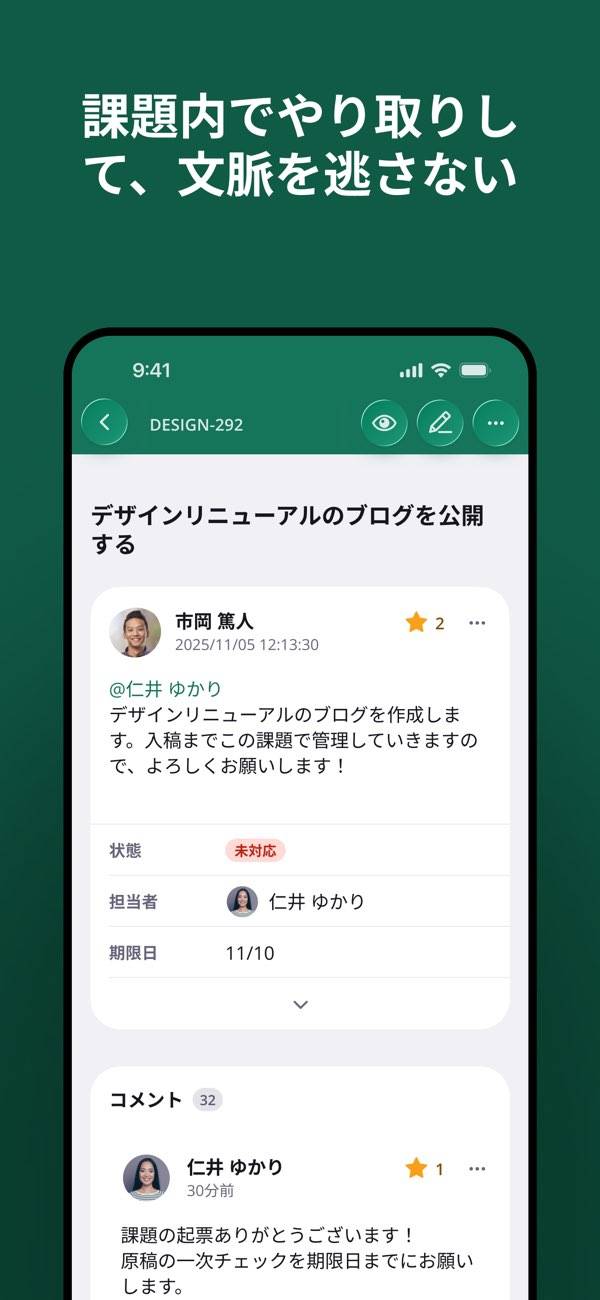 プロジェクトに関わるファイルや情報をまとめ、効率的に管理できます。情報が分散しないので、参照する手間が省けるでしょう。コメントや連絡事項も一元管理でき、引き継ぎの際も安心です。