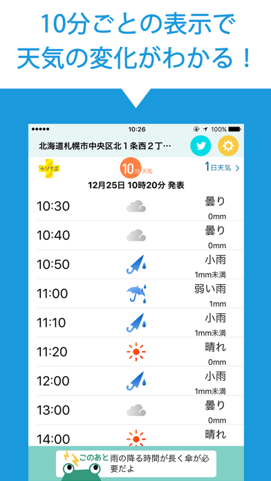 あなたが設定した地点の天気を10分単位で予測してくれます。そして1時間以内に雨が降りそうなときにアラートが届く仕組み。また降水量・時間帯・曜日など通知項目を設定することもできます。雨予報を逃す心配がないので、外出が多い人に重宝するでしょう。