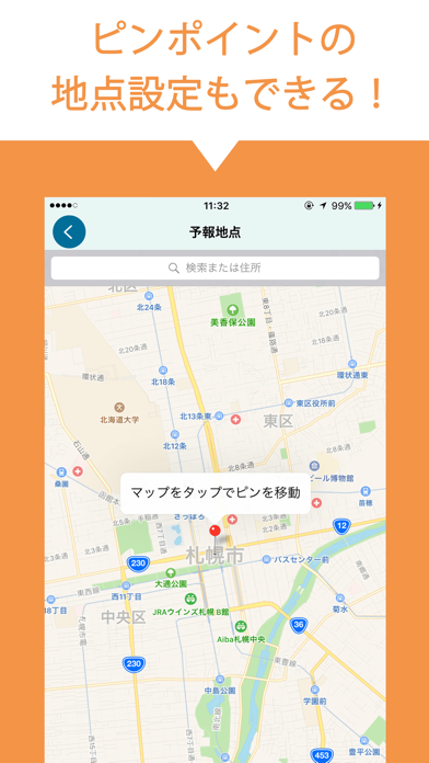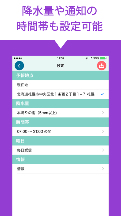 本アプリを使うことで突然の雨に慌てることがなくなるでしょう。設定した場所における雨の予想を事前に知らせてくれます。