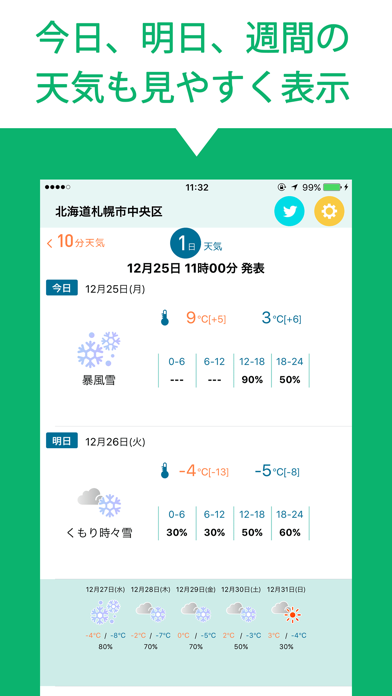 今日や明日・週間の天気予報もチェックできます。GPS機能を搭載しているため、特に設定の必要なく現在地の天気予報をピンポイントで表示。もちろん任意の地点を指定することも可能です。マップ上から選択できるので、住所入力の手間がありません。