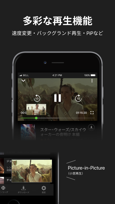 - 画質選択、10秒戻し、スロー再生などを備えた便利なプレーヤー