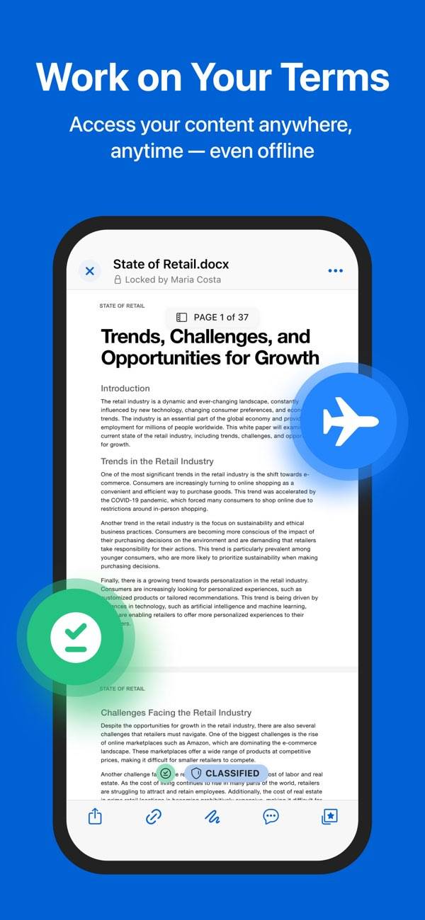 チームで共有しておきたいファイルをすぐに共有できます。アプリ内でファイルを作成できるほか、デバイス内にあるファイルもアップロード可能。いちいちメールなどで送る手間が省けて効率的です。