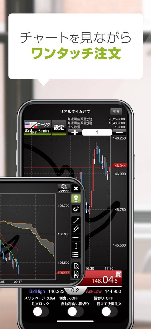 細かな設定なしで、すぐに注文できる機能が魅力。チャートを見ながら、タップ一つで新規に注文し、決済もスムーズ。また、利食いや損切りのポイントを事前に設定すれば、自動で注文が行われます。取引のチャンスを逃したくない方に最適でしょう。