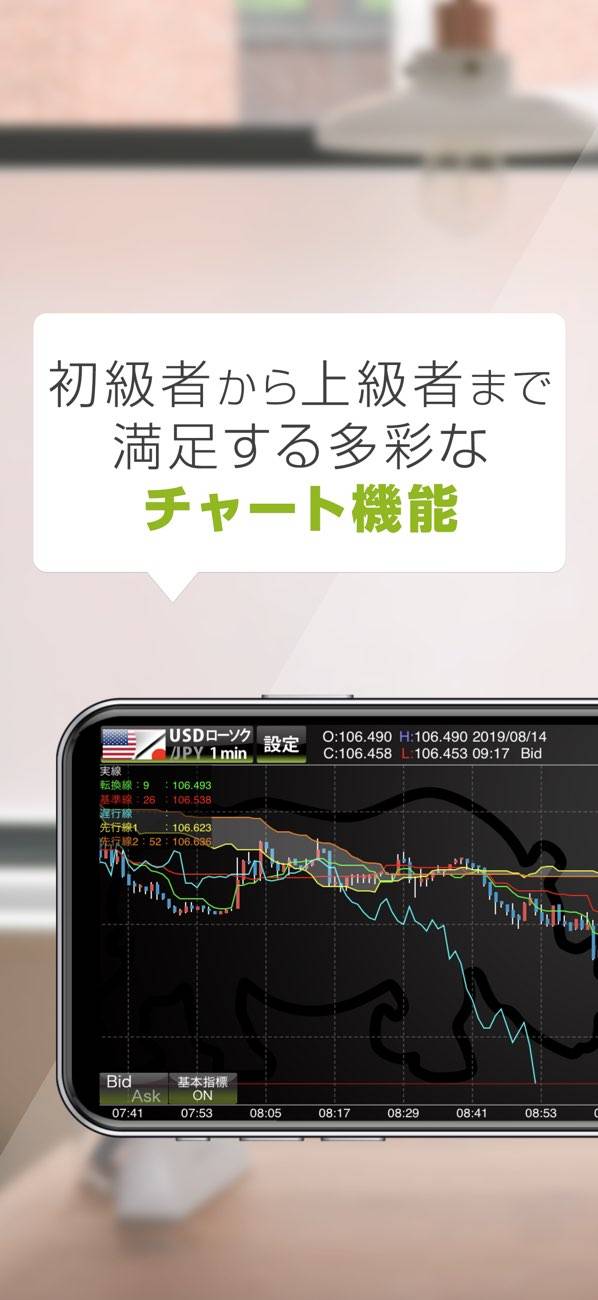 手数料無料で24時間取引可能なアプリで、ワンタッチでスピーディーに注文が行えます。リアルタイムの相場チェックや充実のテクニカル分析機能も魅力。チャートやレートの表示形式を気軽に変えることができるので、自分好みにカスタマイズできます。