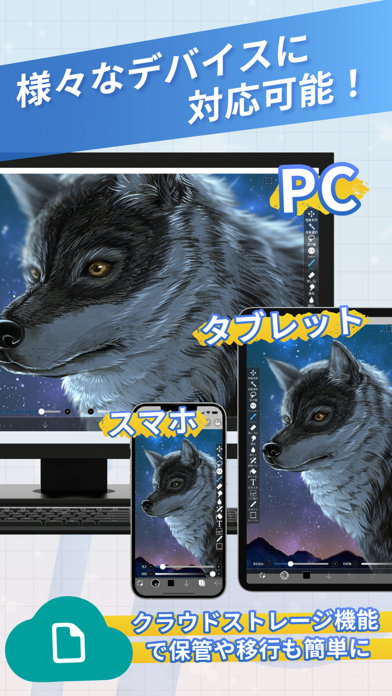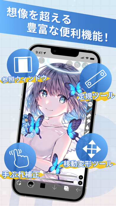 イラストや漫画、厚塗りまでさまざまな2D作品が描けるお絵かきアプリです。手ブレ補正や筆圧感知機能がついており、スマホでの描画にぴったりの環境を用意。またテクスチャやトレス素材などのツールが豊富で、いつでもどこでも本格的な作品制作ができるでしょう。