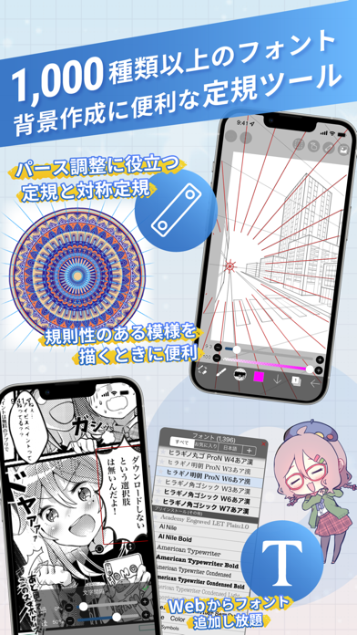 多彩なブラシとツールを使って、イラストを作成できます。ブラシの種類は15,000以上あり、マンガ用のGペンや厚塗りに適したペンなどを収録。「カスタム」機能からオリジナルのペン先を作ることも可能です。